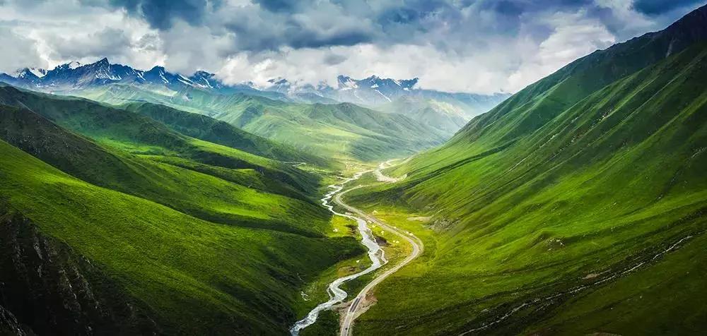 新疆独库公路蜿蜒在天山山脉的草原山谷中