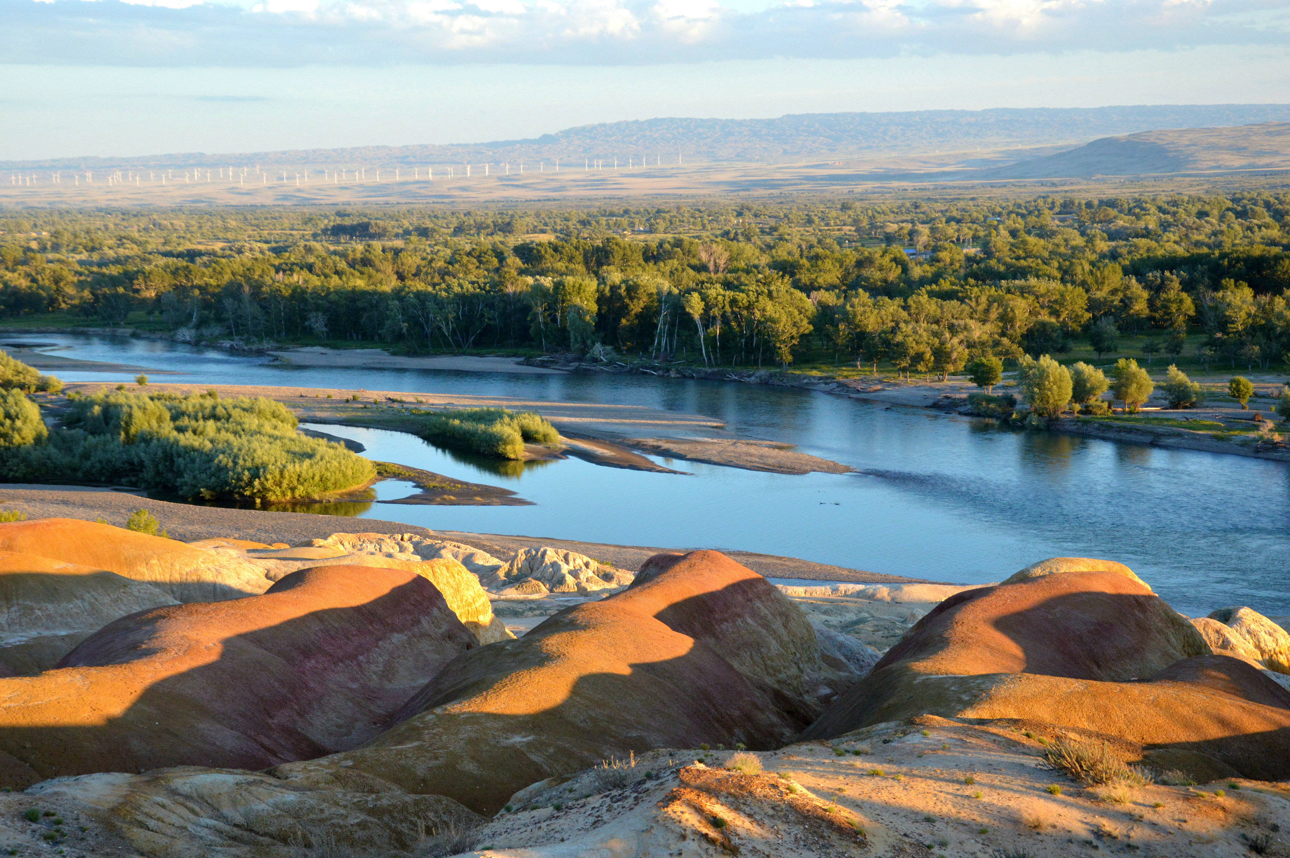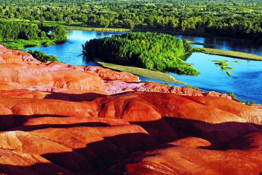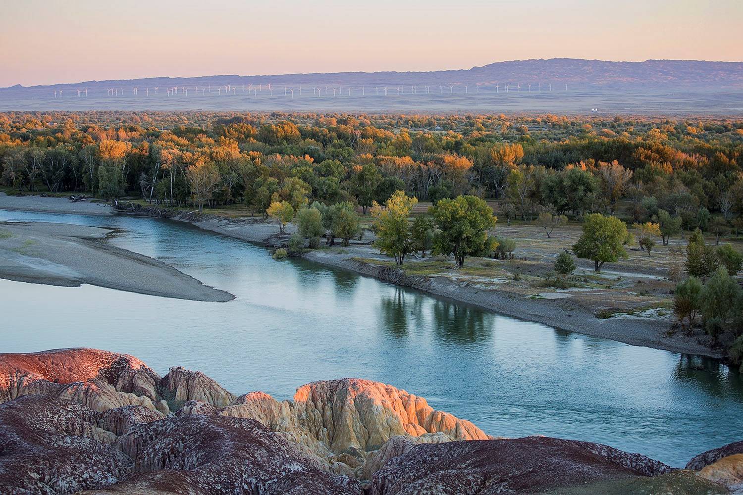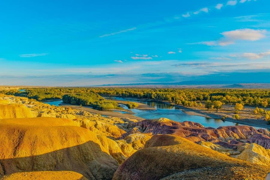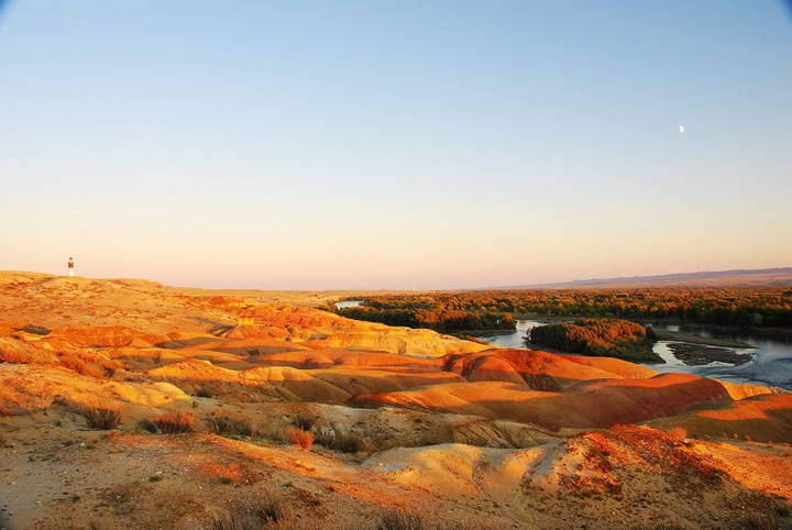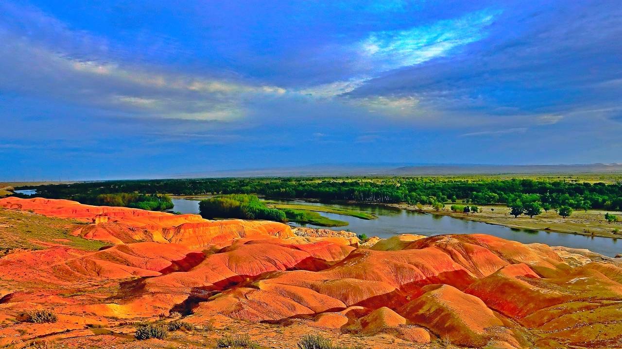 它毗邻碧波荡漾的额尔齐斯河,与对岸葱郁青翠的河谷风光遥相辉映,可谓“一河隔两岸,自有两重天”。激猛的河流冲击以及狂风侵蚀,形成了北岸的悬崖式雅丹地貌,河岸岩层抗风化能力强弱不一,轮廓便会参差不齐,而岩石含有矿物质的不同,又幻化出种种异彩,因此得名“五彩滩”。而南岸却是绿树葳蕤,连绵成林,远处逶迤的山峦与戈壁风光尽收眼底。