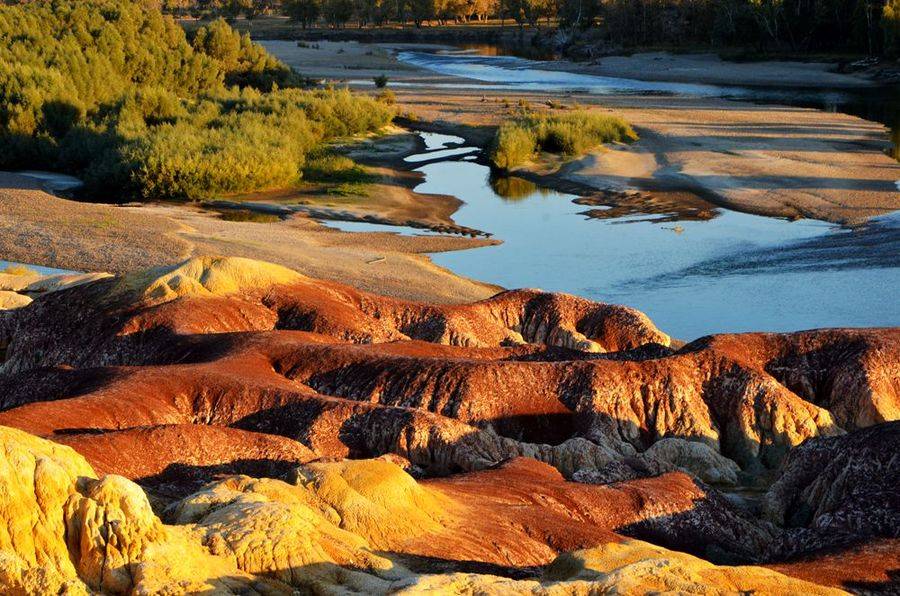 五彩滩的特别,还由于它色彩绚烂,形状缤纷。因为这里有侏罗纪时代的煤层,经过千万年风蚀雨剥以及河水的冲刷,在几乎寸草不生的河滩上出现了红、绿、紫、黄、棕等鲜艳的色彩。在河水的映衬和夕阳的照射下,当你走进这高低起伏的“ 丘陵 ”地带,就如同走进一个五彩斑斓梦幻般的世界,那些光怪陆离的色彩从四面八方扑面而来,都是那么明快、那么强烈、那么丰富多彩,真让你感到目不暇接,眼花缭乱。