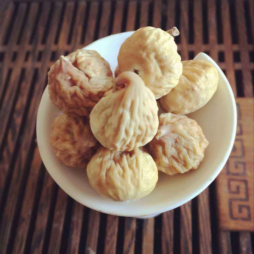 无花果,果树雌雄异花,花隐于囊状花托内,外观只见果而不见花故名。果形扁圆,果皮黄色,果肉细软,营养丰富,果味甘甜如蜜。果实除食用外,还可健胃清肠,消肿解毒。无花果的果实极为鲜嫩,不易保存和运输,当地人民多用以晒制果干,运销外地。