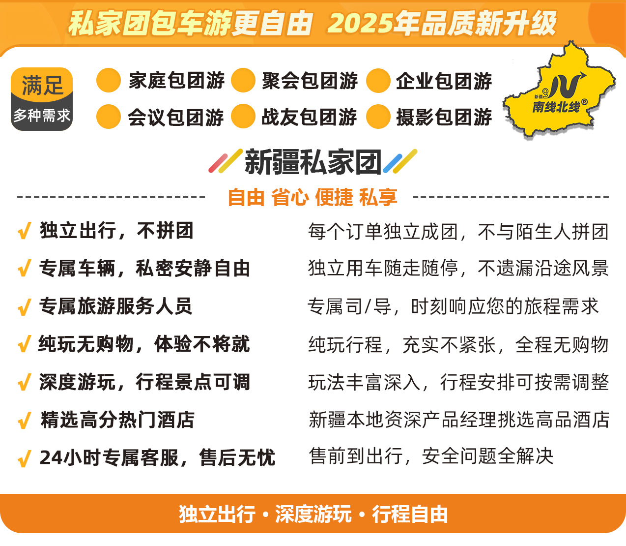 包团优势:一单一团,随时出发,专属司机专属车辆,随景随停游览时间灵活,自由度高玩得更尽兴;礼品赠送:男士赠送新疆民族特色花帽,女士赠送新疆民族特色丝巾,赠送地图册每人一份; 郑重承诺:优质服务打造行业规范,绝不更换景点,不压缩游览时间,不减少景点;全程不进购物店