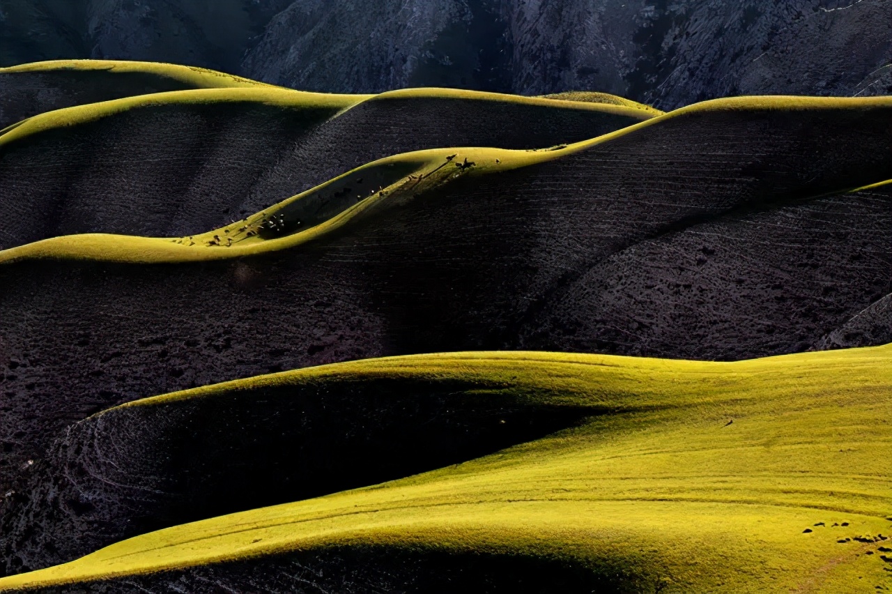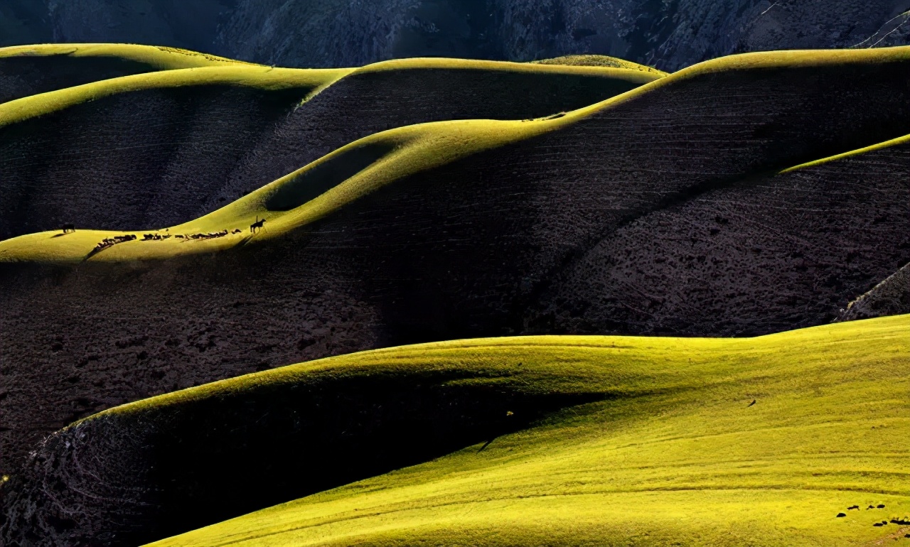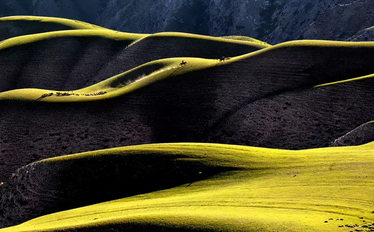 你以为这样的喀拉峻已经足够美,不不,这些其他草原也有,不足为奇,下面才是独一无二的惊艳!群山起伏成极富韵律的曲线,如大海掀起的层层波浪,为茫茫草原平添一份奇特动感的美,只一眼就震撼到失了言语。