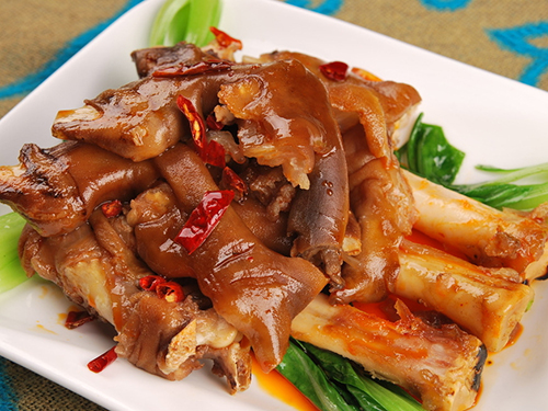 3、羊蹄入老汤锅炖烂(指蹄筋)后入盘,把羊蹄卤到熟烂,羊蹄本身没有什么肉,就是一层皮,要小心不要过烂,导致骨肉分离的悲惨下场。卤好后,捞出,用胡椒、辣面等佐料拌匀即可,或者可以淋一些刚才的卤汤汁。