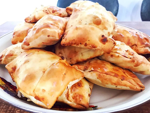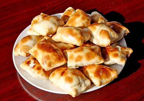 烤包子(维语叫“撒木萨”)和薄皮包子(维语叫“皮特尔曼它”)是维吾尔族同胞喜爱的食品之一。城乡巴扎的饭馆、食摊多销售这种食品。烤包子主要是在馕坑烤制。包子皮用死面擀薄,四边折合成方形。包子馅用羊肉丁、羊尾巴油丁、洋葱、孜然粉、精盐和胡椒粉等原料,加入少量水,拌匀而成。把包好的生包子贴在馕坑里,十几分钟即可烤熟,皮色黄亮,入口皮脆肉嫩,味鲜油香。