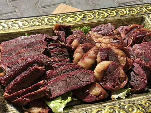新疆伊犁的熏马肉和熏马肠是哈萨克族过冬必备的食物,每年11月底到12月份,是哈萨克族牧民熏肉的旺季。他们在这个时候,要挑选一些膘肥体壮的牛、马、羊宰杀后供过冬食用。为了使这些肉能较长时间的保存,他们采用了多年的方法--熏。初冬开始,哈萨克人家要屠宰牲畜备冬肉,腌制熏干越冬,熏制的肉香味浓郁、耐贮藏。市场上出售的熏肉基本相似,再增加些佐料,如孜然、胡椒、花椒、洋葱等,可煮熟、蒸食。熏马肠是熏肉中的上品。