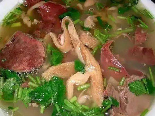 青海人民把杂碎汤泡馍看成是最美好的早餐。它既能补身、耐饥,又能抗寒。杂碎是指煮熟的牛羊的头、心、肺、肠、胃、四蹄等,俗称“下水”。它又分两种,即“牛下水”或“牛肉杂碎”、“羊下水”或“羊肉杂碎”。杂碎汤就是杂碎煮成的汤,即下水下锅后,加调料、山楂等物,文火煮,肠肚烂后捞出,继续煮头蹄,去上层油 凝固(称“化油”),全部捞出备用。汤中加一些干葱丝、绿芫荽等调味品。杂碎汤香味浓、不腻、补身。